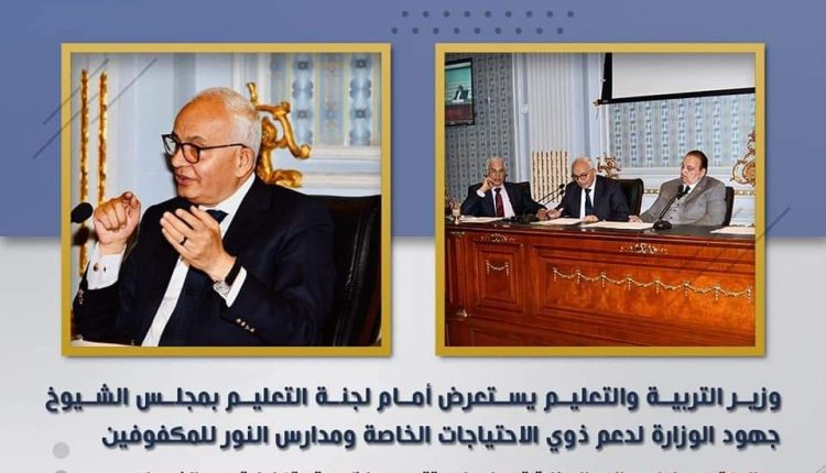 وزير التربية والتعليم يستعرض أمام لجنة التعليم بمجلس الشيوخ جهود الوزارة لدعم ذوي الاحتياجات الخاصة ومدارس النور للمكفوفين ويؤكد أن الوزارة تعمل على تقديم منظومة متكاملة من الخدمات لذوى الاحتياجات الخاصة، ويرحب بدراسة مقترح لدمج التكنولوجيا بالعملية التعليمية بمدارس النور للمكفوفين وتوفير الادوات اللازمة لتتناسب مع التقدم التكنولوجي والتعلم عن بعد.
