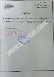 أصدرت إدارة جنوب الجيزة التعليمية، قرارا بفصل التيار الكهربائي عن جميع المراوح الموجودة بالمدارس التابعة للإدارة التعليمية، مشيرة إلى أنه من يخالف ذلك يتحمل المسؤولية القانونية.