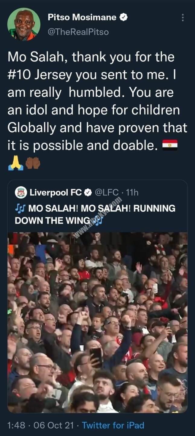 وكتب بيتسو موسيماني على صفحته الرسمية على توتير قائلا: “مو صلاح، شكرًا لقميصك رقم 10 الذي أرسلته لي، شعرت بالتواضع حقًا. أنت قدوة وأمل للأطفال في العالم كله وأثبت أن ذلك ممكنًا”.