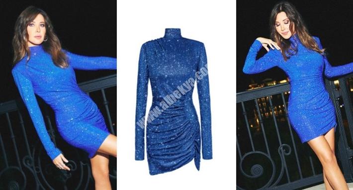 حيث أطلت نانسي عجرم بفستان قصير بأكمام ورقبة طويلة بالون أزرق لامع.